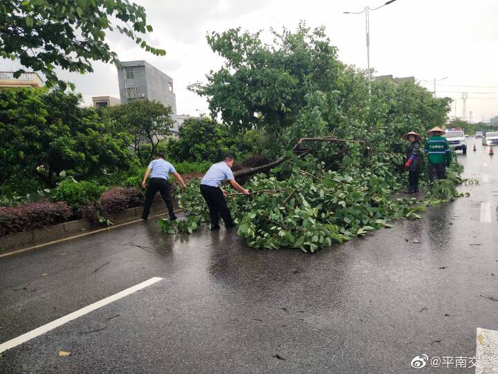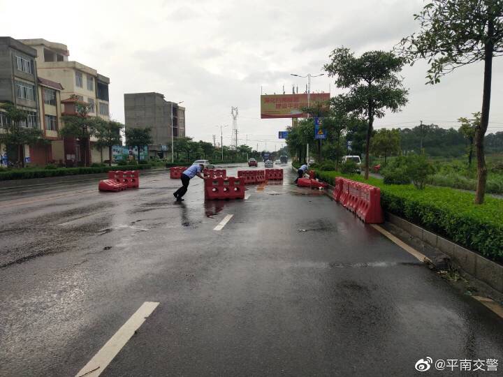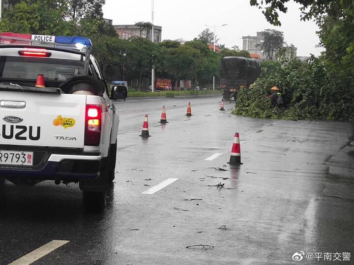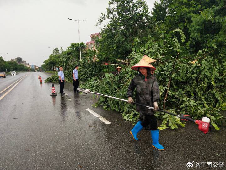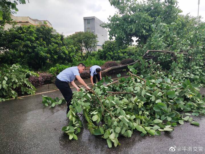 7月15日下午,平南县城风雨交加,由于风力太大,导致迎宾大道社垌路段有大树树枝被大风刮断,横在马路,路中的水马也被吹得东歪西倒,影响了道路安全通行,存在较大的安全隐患。平南县公安局交警大队特勤中队巡逻至此发现有隐患,立即采取紧急措施,摆放锥筒警示过往车辆注意安全。随后特勤中队民警、辅警与住建设局园林所的人员立即在现场进行隐患排查工作,将散落在路上的树枝清理干净,并把吹倒的水马移到安全位置,快速将现场交通恢复正常,保障了道路的安全畅通。平南交警温馨提示:近期雨水多发,辖区部分路段会出现积水、塌方等情况,请广大交通参与者在出行的过程中,注意观察路面情况,如遇大暴雨请尽量减少外出,车辆行驶过程中,经过弯道、狭窄路段,注意鸣笛减速。