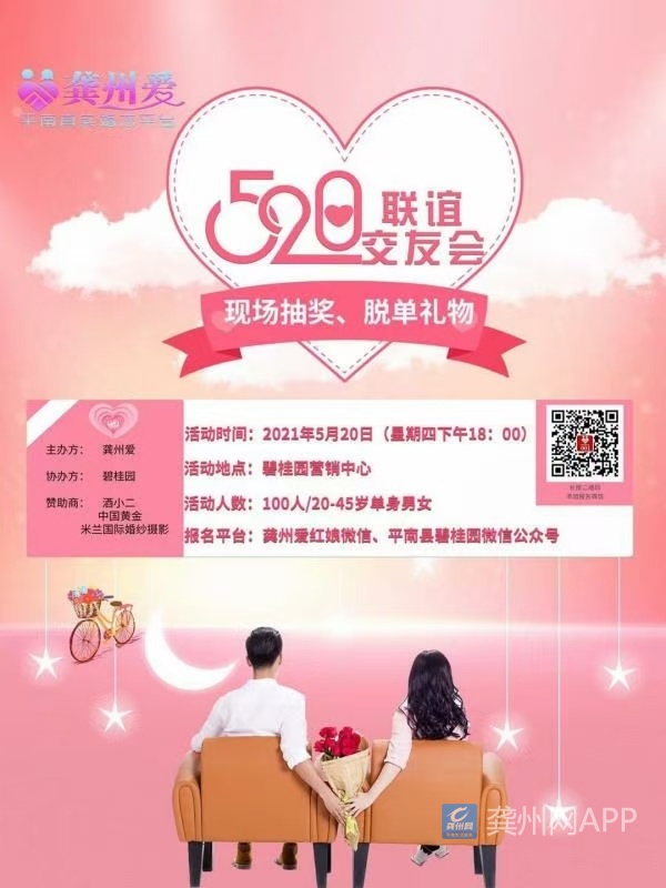 诚挚邀请平南单身的你/她/他参加由我们龚州爱携手碧桂园营销中心举办的大型线下交友派对会,本月5月20日(星期四)下午18:00,欢迎你们的到来,报名详情可私聊红娘咨询,现场惊喜不断,到场的都可免费获得有中国黄金及米兰国际婚纱摄影赠送的价值1500元的大礼包一份,现场牵手的嘉宾还可获得神秘大礼