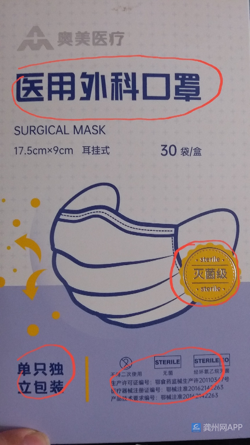 第二,看包装标注,是否是医用外科口罩,单独包装,有灭菌标志,是否有医疗器械证编号